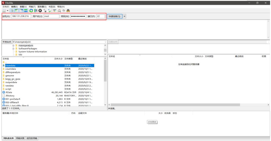 我们在生物信息分析过程中经常会进行数据的传输,可能会遇到要往Linux中传输数据文件,我们分析的结果也要传到我们的Windows系统,这个时候可以使用sftp工具实现文件的传输:FileZilla软件就是一个很不错的工具,可以去这里下载:https://www.filezilla.cn/download/client 安装完成打开之后会看到以下的界面: