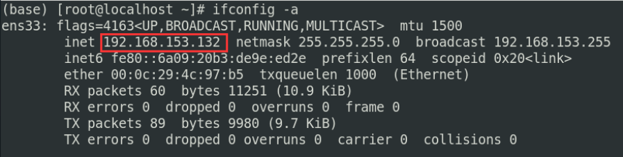 第一个ens33中的192.168.153.132就是我虚拟机的IP地址。需要注意的是,要用MobaXterm等软件登录虚拟机的话,事先得开机。