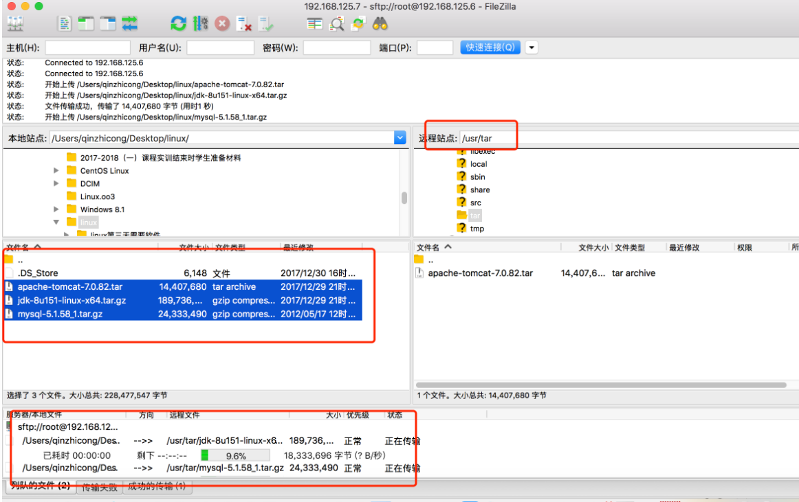 2、连接到Linux服务器后,视图左边区域为本地磁盘,右边区域为Linux服务器的磁盘区域,我们在/user路径下新建一个文件夹tar(单击右键,可以新建文件夹),将文件拖拽进去,如图: