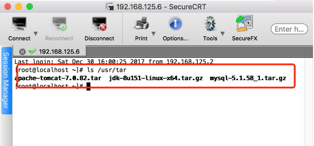 二、通过SSH软件SecureCRT连接到Linux服务器,查看上传的软件: