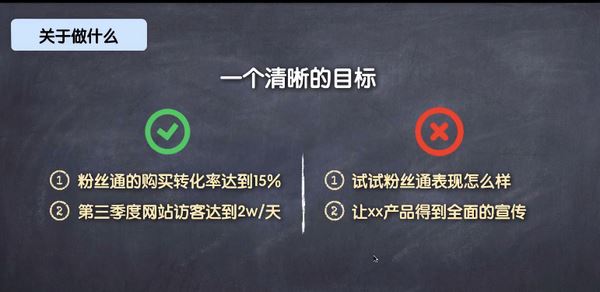 【我们做方案的时候要有一个清晰的目标,清晰的目标会有一条明确的时间线和有一个可以计量的数据结果】我们看看,左侧是2个清晰的方案目标,(粉丝通的购买转化率应达到15%,这个目标前要加个时间点,我们就说8月份吧)有时间点,有具体的结果。而右侧则是2个含糊不清的目标,比如让xx产品得到全面的宣传,什么叫全面的?请问什么叫全面的?如果是这样的一个含糊的目标,我又怎么去分解这样的一个目标呢?分解我的工作步骤呢?根本就无法分解,所以就导致你做的每一件事情都没有目的性。