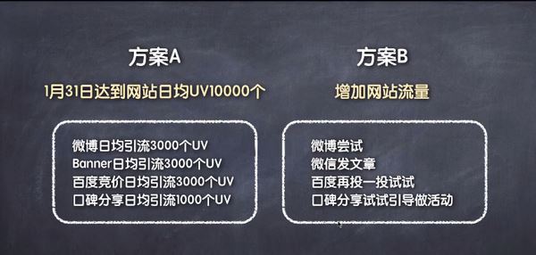 这是两个不同的方案:方案A 与方案B ,方案A 的目标是【1月31日达到网站日均UV(独立访客)1000个】这是一个明确的目标,有时间线,有可测量的数字结果。方案B的目标是【增加网站流量】,这是一个不合格的目标。