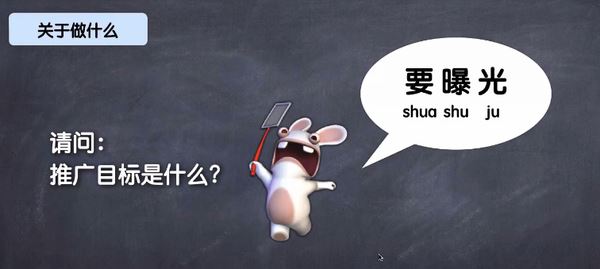 你去问一个做策划方案的人员,请问你这个方案的推广目标是什么?他回答你:要曝光,要越多越好的曝光。好的,曝光,可曝光是一个正确目标吗?当然不是!一个正确的目标要有一条明确的时间线和有一个可以计量的数据结果。如果你没有确定好一个目标,那你做的策划就相当于是一坨屎,你会为了你的曝光的目标去刷数据,可刷数据有用吗?这对公司的业务一点作用都不起。。