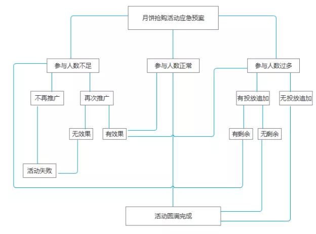活动运营在设计活动时应考虑到活动中可能遇到各种突发情况,做好相对预案应对措施,并在活动进行中一旦发现问题迅速启动应急预案。在这个案例中除了活动正常进行,还要考虑到活动参与人数不足怎么办,要不要再次推广通知;活动过于火爆,大部分抢不到怎么办,投放的月饼礼盒数量会不会有追加,这些都需要提高考虑到并做好应对措施。活动运营做活动预案可以文字写下来,也可以做成预案流程图,任何形式都行,但一定要考虑周全,把逻辑理顺。