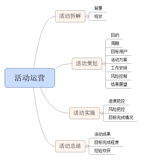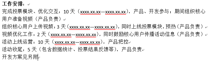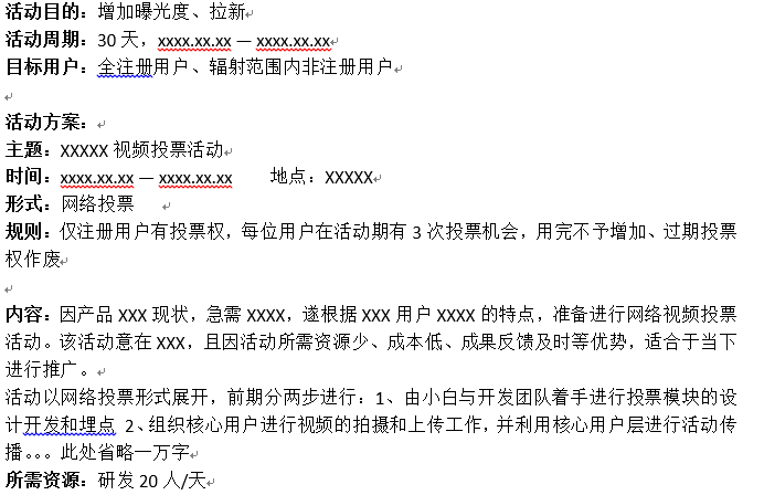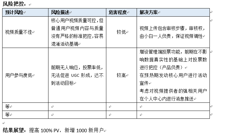 活动目的:组织活动的意义。基本只有一个主要目的,可酌情缀上几个连带小目标(比如一个亿) 活动周期:活动的周期。与活动时间不同,包含前期准备、后期收尾等等。。根据不同活动,写清具体时间 目标用户:活动的对象。你的产品有Hin多用户的时候,一定要好好考虑这个问题,切记不要打扰到非相关用户 活动方案:包含 活动背景、活动主题、主办承办、活动时间地点(具体)、形式内容、文案、规则、推广方式、经费预算、所需资源等等,只要是牵扯到的,一定要详细说明!敲黑板!看重点! 工作安排:方案定了,但没进行工作安排?港真,作者我是不信的 风险把控:不想眼泪在风中颤抖,就一定做好风险把控,列个小表格把预计风险、风险描述、危害程度、解决方案啥的,统统写进去,只要把控得当,风险?大可不必惊慌~~眨眼 结果展望:操心劳力的,会有什么收获啊、能完成什么目标啊、可以起到什么战略意义啊等等,切记别好高骛远,乱写一通出了问题,可别怪该配合出演的作者,演视而不见哟~