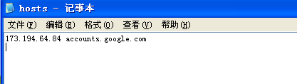 4关闭浏览器,打开我的电脑,输入C:\WINDOWS\system32\drivers\etc,更改hosts文件,加入173.194.64.84 accounts.google.com。
