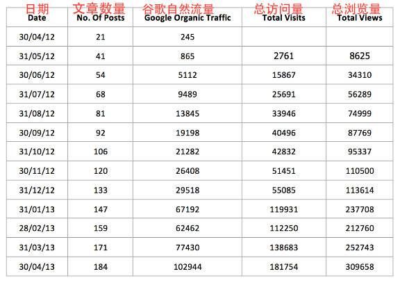 2012年4月成立,到2013年4月底,来自谷歌的月度流量是10.3万人次。下面是12个月的数据。