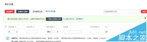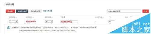 5、按照如下步骤设置:选择记录类型为A记录;主机记录为空或填写www;记录值填写要绑定的主机IP地址;TTL默认即可。点击保存,即可完成域名解析设置。