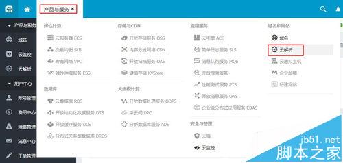 2、在上方主导航位置点击【产品与服务】--【云解析】,查看域名解析列表;