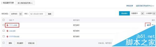 3、选择需添加解析的域名,点击右侧【解析】操作入口,即可进入到域名解析设置页;