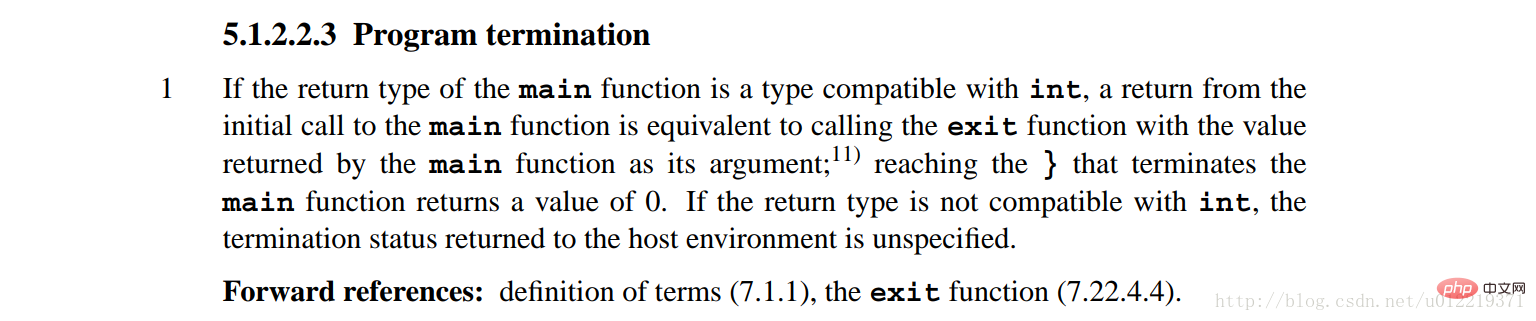 从上面的测试来看,写法1在C90标准下可以正常编译,而在C99和C11标准下会抛出一个警告(不写返回值,默认的返回值为int,也就相当于写法1和写法3等价)。写法2-6在C90、C99、C11标准下均能正常编译。在这么多写法中,到底哪一些才是main函数的标准写法?于是查阅了C标准文档对main函数的规范写法,见下图: