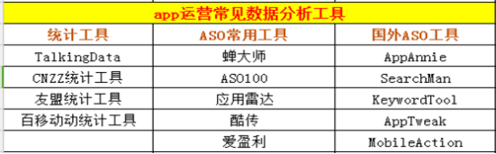 APP运营过程的各类数据都需要借助工具来分析,基于数据的分析是衡量APP运营效果的指标,同样的,数据也被广泛的用于制定后续的APP运营策略。因为个人偏重于ASO,所以常用的工具是蝉大师ASO工具,大家也可以根据自身的情况选择适合自己的工具,下图为常见的APP数据分析工具。