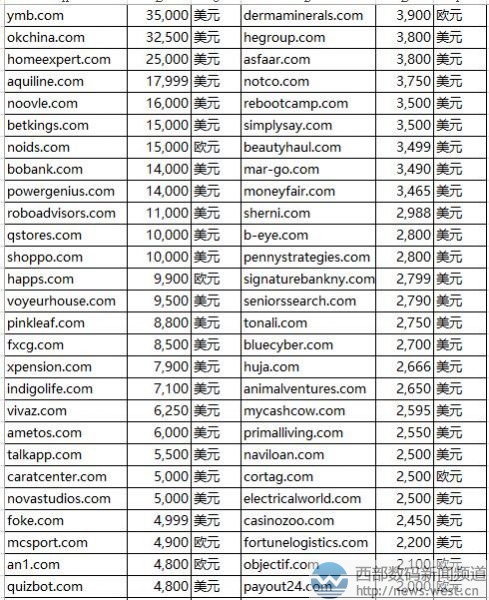 西部数码(west.cn)6月28日消息,最新一期的sedo交易榜出炉,本期上榜的域名共有78个,其中卖价最贵的是三字母域名 YMB.com,成交价为35,000美元,约合人民币24万元。