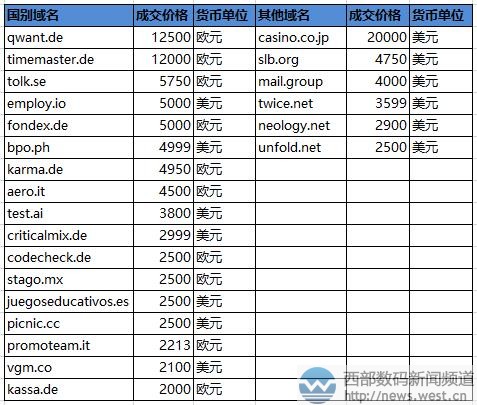 国别域名方面,两个德国域名表现抢眼,域名qwant.de和timemaster.de分别以12500欧元和12000欧元结拍。其中,qwant.de对应有法国搜索引擎,官网域名为qwant.com。而timemaster.de则有“时间主节点,时间主控器”之意思,对应有美国科幻片Timemaster,另外一款电穿孔美容仪也与之对应。