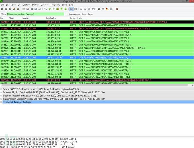 同样我们也可以只进行arp欺骗,通过wireshark进行抓包分析,劫持cookie。以上是劫持qq 数据。