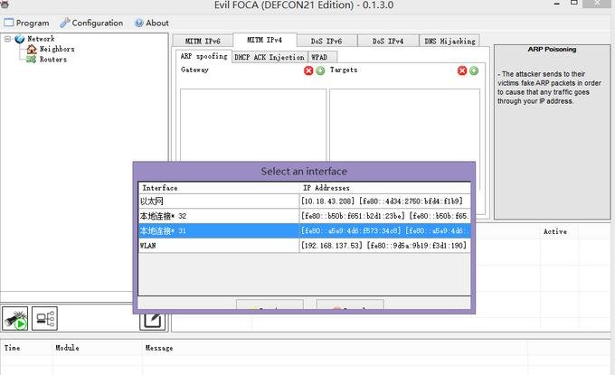 这时会自动扫描出局域网内所有的机器ip地址和网关,当然你也可以添加ip,这里我们以10.18.43.209这台机器作为受害者。