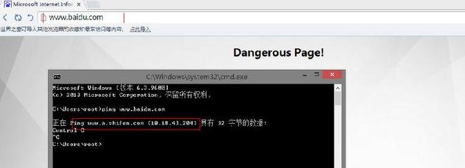 此时受害者的机器百度页面已经转向 Dangerous Page,ping指向10.18.43.204。