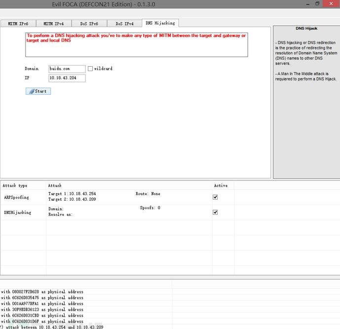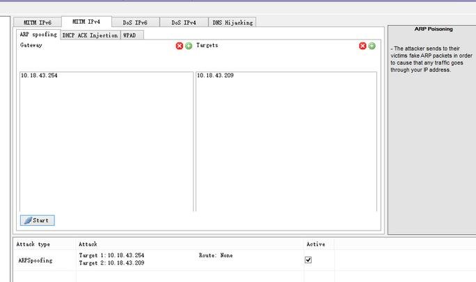 在MITM iPv4目录下分别填写网关GateWay10.18.43.254和目标10.18.43.209,点击start,确定ARPspoofing为活动状态。