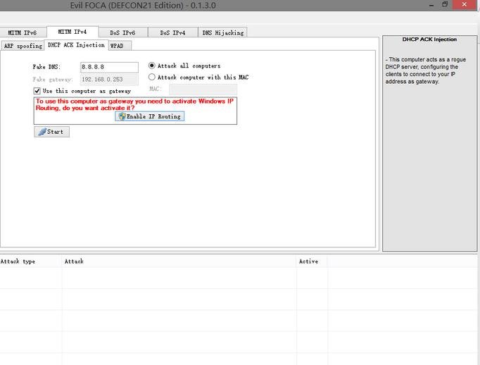 DHCP ACK污染,可以伪造DNS和网关,以本地作为整个局域网网关,需要开启ip路由,点击start,将会截获整个局域网的包,整个局域网将在控制内。