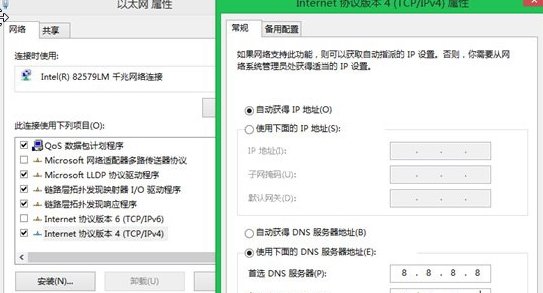 2、打开属性,选择TCP/IPV4,手动设置DNS服务器,例如8.8.8.8,8.8.8.4,确定后,生效。