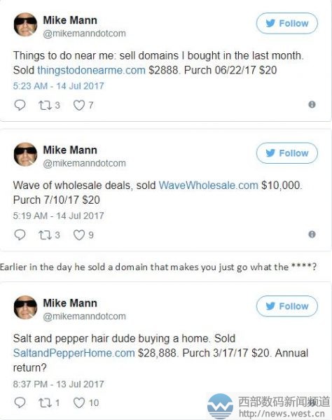 西部数码(west.cn)7月14日消息,说真的,小编每次报道Mike Mann的交易消息时,内心都有止不住的羡慕嫉妒恨。尤其是今天这几个域名的交易,小编真的有一种“老大爷倒了都不扶”(不要当真),就服Mike Mann。