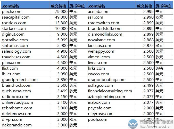 西部数码(west.cn)5月3日消息,最新一期的sedo交易榜出炉,本期上榜的域名共有57个,其中卖价最贵的是人名域名piech.com,成交价为79,000美元,约合人民币54万元。