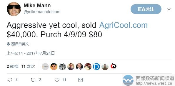 西部数码(west.cn)7月25日消息,昨天国外大佬Mike Mann发推称,英文域名AgriCool.com以40,000美元成交,约合人民币27元。而这枚域名当时的成本仅为80美元,人民币539元。