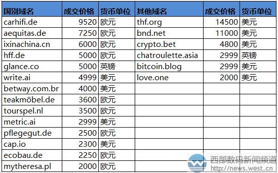 国别域名方面,本期多个德国域名成交。其中,价格最高的域名carhifi.de以9520欧元结拍,约合人民币7.5万元。主体“hifi” 常用来表示音响设备的“高保真度”,可作为车载音响品牌的官方域名。除此以外,域名aequitas.de以7250欧元结拍,hff.de以5000欧元结拍,另外teakmobel.de、ecobau.de等域名也榜上有名。