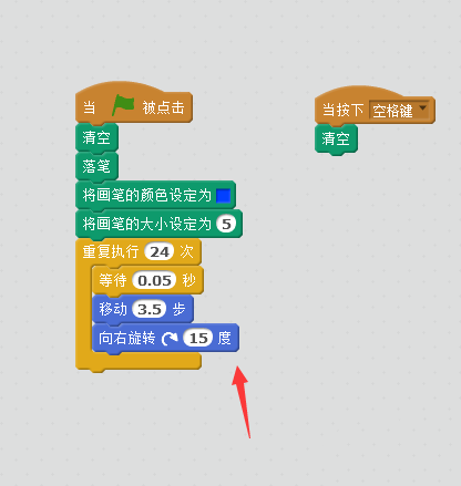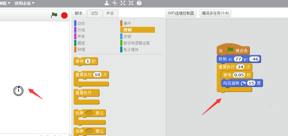使用scratch制作一个简单的计时器,让它实现指针转动,周边填充颜色。