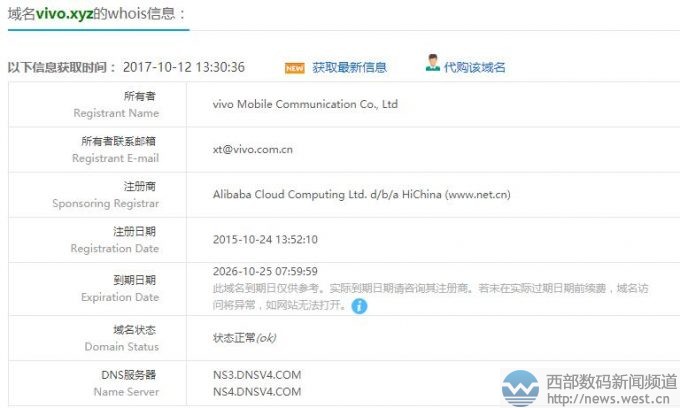 查询whois信息可以发现,域名vivo.xyz注册于2015年10月,最近的更新日期为今年4月份,所有者显示为维沃移动通信有限公司(vivo Mobile Communication Co., Ltd)。从这个时间推断,域名vivo.xyz应该是在4月初就完成了交易。