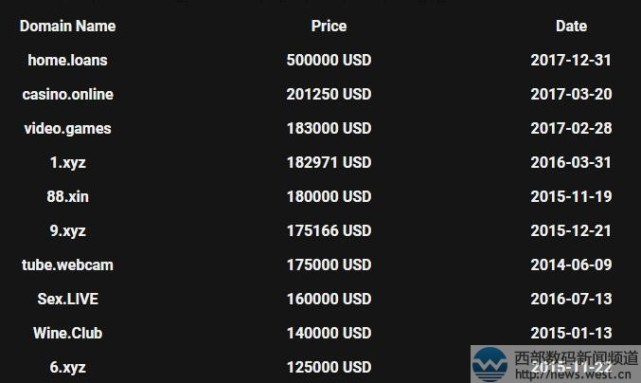从国外sold.domains网站统计的数据来看,2015年交易价格最高的域名为88.xin,价格为180,000 美元;到了2016年初,在新顶级域名行情看涨的情形下,三字母域名1.xyz在西部数码拍出了182,971美元的高价,在全球备受瞩目。随后是2017年,两枚游戏娱乐类域名video.games和casino.online先后高价成交,不过截至目前,冠军宝座却被home.loans以500,000美元摘得。
