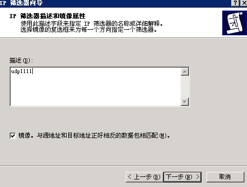 点击添加以后会提示下一步,点击下一步后,描述里面填写udp描述,示例以1111为例