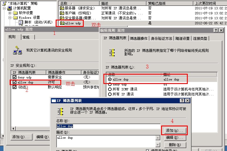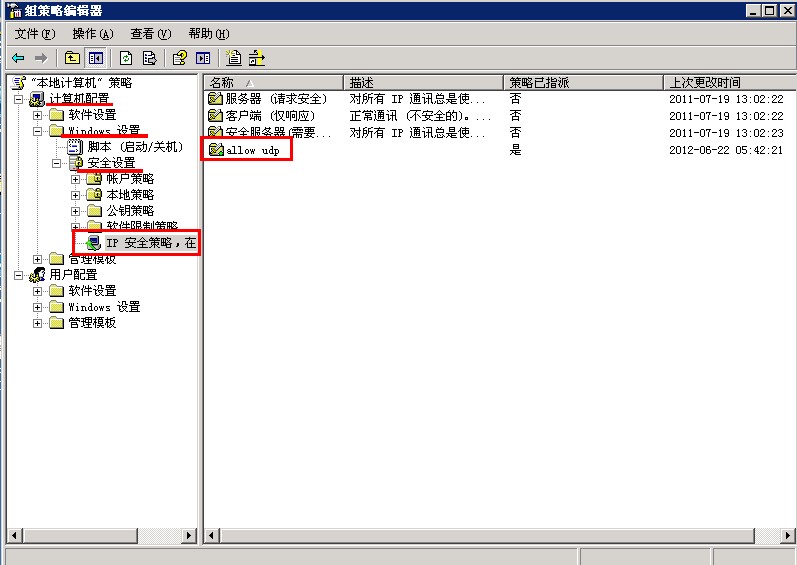 第一步:首先远程登录到服务器,远程登录请参考:http://www.west.cn/faq/list.asp?unid=417 登录以后在运行里面输入gpedit.msc回车,依次展开 计算机配置--windows设置--安全设置 打开IP安全策略,然后找到allow udp,如下图所示: