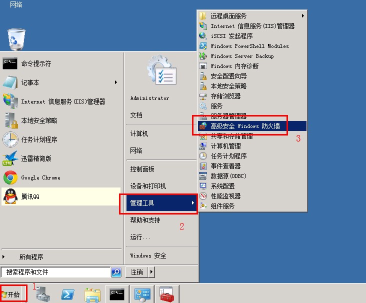windows2008系统策略开启和windows2003一样,只是防火墙端有一点不一样,开始--管理工具--高级安全window防火墙