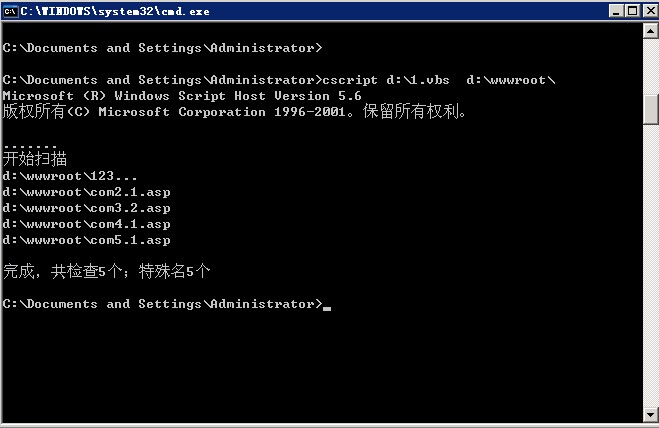 cscript d:\1.vbs d:\wwwroot\ftp名\ 然后按回车键即可。(后面d:\wwwroot\ftp名\是实际需要扫描的路径)
