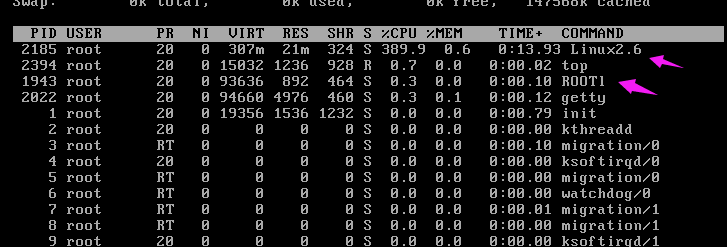 可以用top命令查看是否有占用CPU较高的进程,下面截图的进程异常,并且占用较高CPU