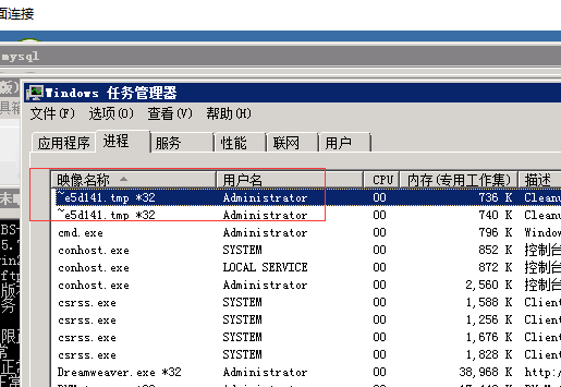 通过任务管理器查看是否存在异常进程,比如phpstudy被黑后可能存在12345.exe这类数字开头的进程。或者一些temp临时文件以管理员身份运行