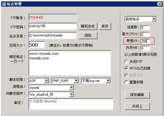 查出某个站点太占用带宽,可以在网站管理助手设置带宽大小,如图: