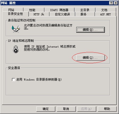 点击“目录安全性”,打开“IP地址和域名限制”的编辑,如图: