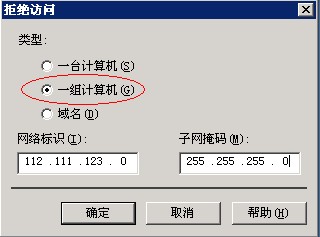 此处我们以屏蔽一个C类地址为例,我们要屏蔽112.111.123.*这段地址,类型选择“一组计算机”,网络标识将*换成0,填写112.111.123.0,子网掩码 255.255.255.0,如图:
