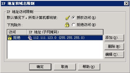 如果要限制一个IP段,比如要限制112.111.123.*这个C段,则输入: