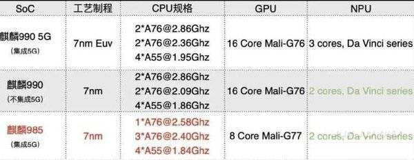 从芯片命名来看,可以得知麒麟985性能介于990和980之间,它只有一个A76超大核心,虽然和友商一样使用最新G77架构,但核心数量相较于990少了一半,所以性能并非想象中的完美。