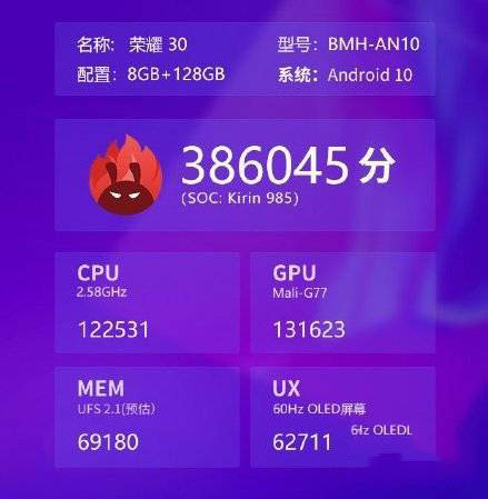 1、麒麟985目前首发在荣耀30上,那么荣耀30的跑分就具有一定的代表性了,下面我们就来看看荣耀30跑分成绩: