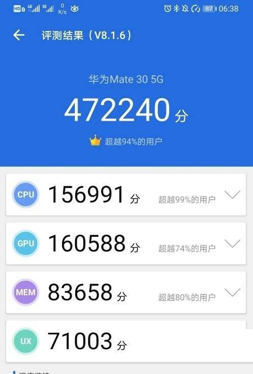 2、麒麟990 5G版的代表机型有华为mate30 5G系列,下面我们就来看看华为mate30 5G版的安兔兔跑分: