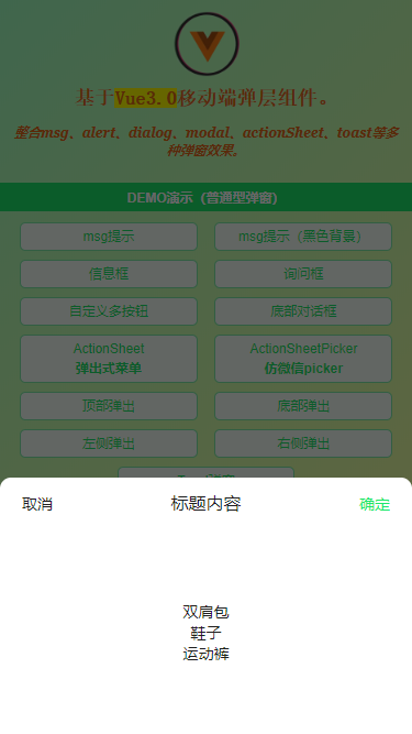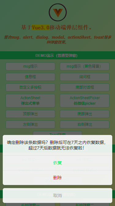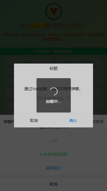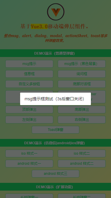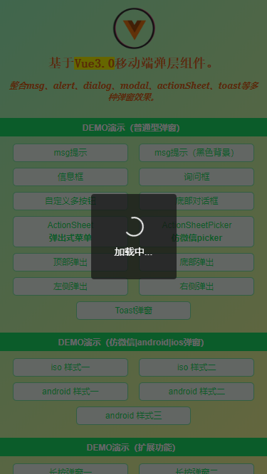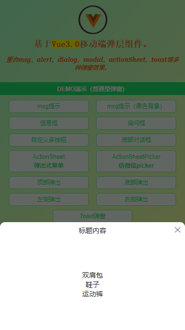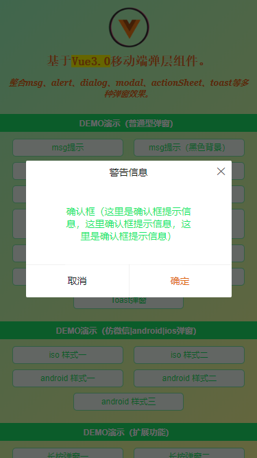 V3Popup 基于vue3.x实现的移动端弹出框组件,集合msg、alert、dialog、modal、actionSheet、toast等多种效果。支持20+种自定义参数配置,旨在通过极简的布局、精简的调用方式解决多样化的弹框场景。