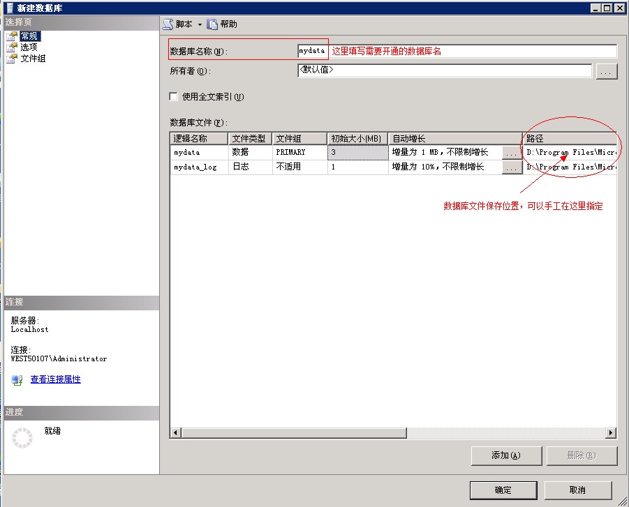 填写数据库名,如mydata,选择数据库保存路径,一般可以保持默认地址,点击“确定”。