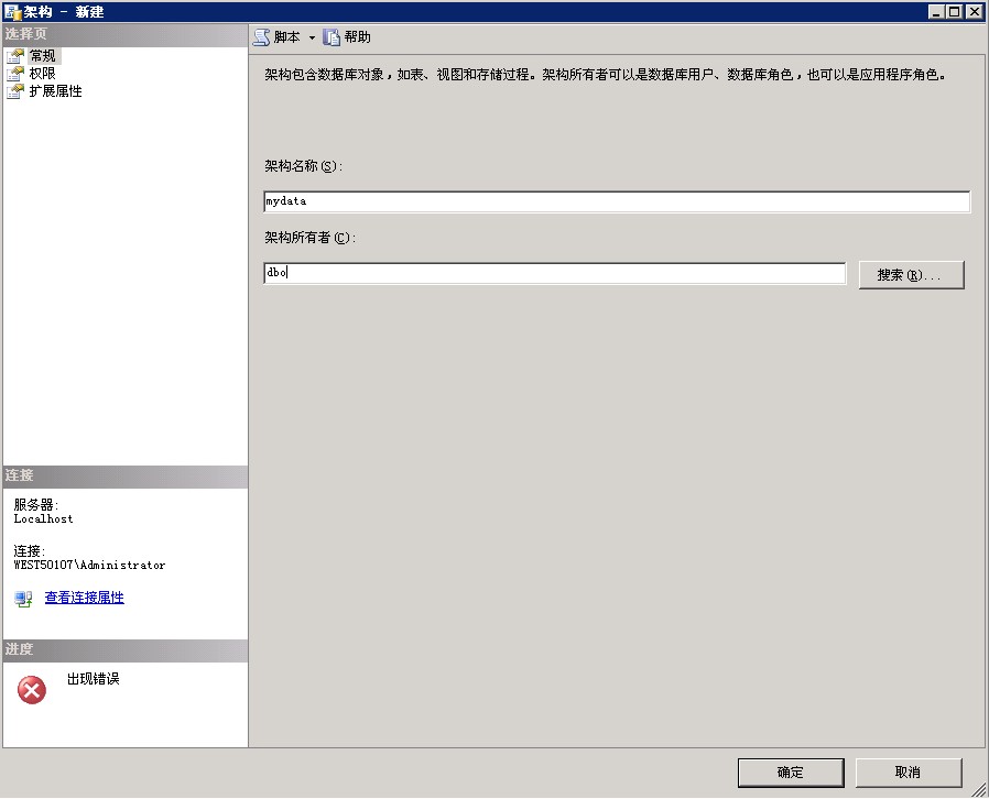 若是数据库名或其他架构,如为mydata架构,需要在“安全性”——“架构”,新建一个所有者为dbo的mydata架构。