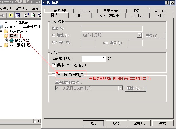 4、检查C:\windows\system32\LogFiles\ 有多大,W3SVC*类似的文件夹是IIS日志,可以直接删除。若不需要日志文件,可以打开IIS,“网站”——“属性”,去掉“启用日志记录”的勾,然后点保存,如图: