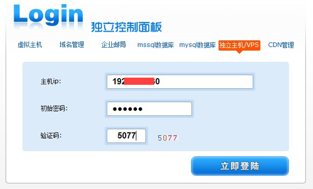 若您是从独立控制面板登陆,其操作方法也是一致的。打开www.myhostadmin.net独立控制面板,点击“独立主机/VPS”,输入主机内部地址(内网IP)和服务器开通时的初始密码登陆,登陆后根据上述提示进行解析操作。