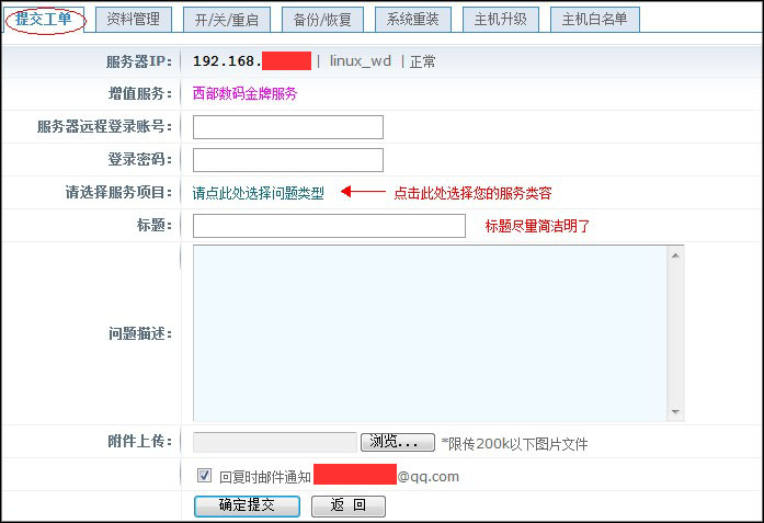 选择需要维护的服务器,点对应的工单按钮提交工单,选择您的问题类别,并提交详细问题,就可以了,如图: